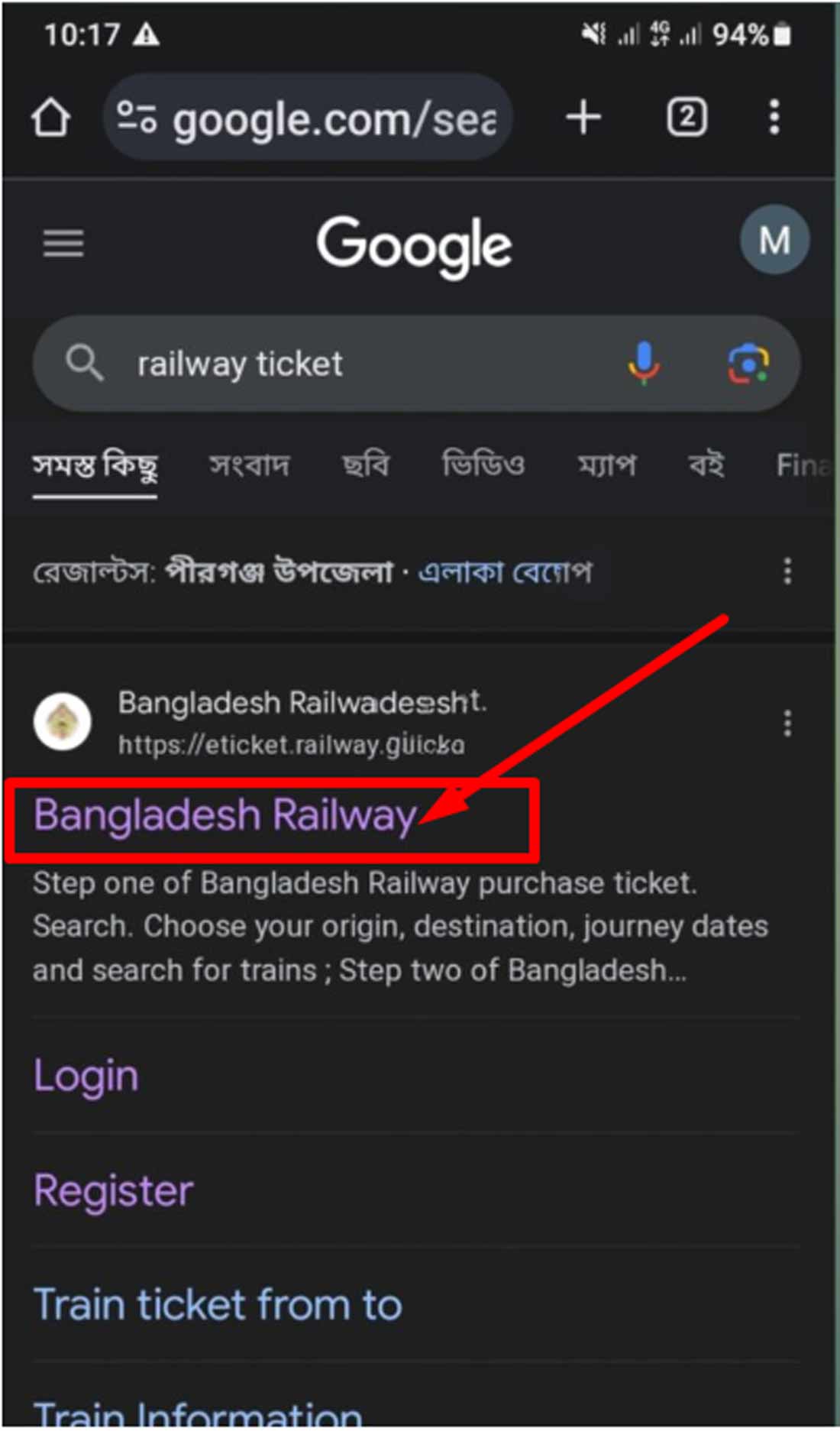 পেজ থেকে Bangladesh Railway ওয়েবসাইটটি খুঁজে বের করে ক্লিক করুন ।
