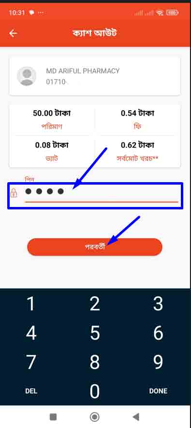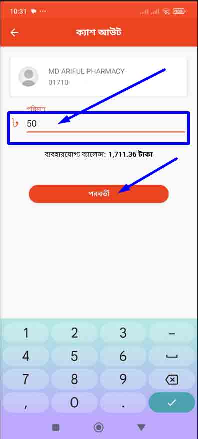 ধাপ ৪ঃএবার আপনি উপরে দেখতে পাবেন কম্পানির নামসহ/উদ্যোক্তা একাউন্ট নাম্বার । মাঝখানে টাকার পরিমাণ। তার নিচে আপনার ব্যবহারযোগ্য ব্যালেন্স।এবং একদম নিচে পরবর্তী লিখা। এখন আপনি মাঝখানে টাকার পরিমাণ এর জায়গায় আপনি যত টাকা বের করতে চাইতেছেন , সেই টাকার পরিমানটা লিখুন। লিখা হলে আপনি নিচের পরবর্তী বাটনে ট্যাপ করুন।