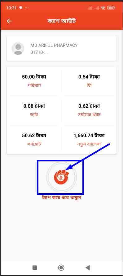 ধাপ ৬ঃ এখানেও আপনি সকল তথ্য দেখতে পাবেন।যেমন উদ্যোক্তা একাউন্ট নাম্বার , আপনার টাকার পরিমাণ , ফি কত নিল, ভ্যাট কত ,এবং সর্বোমোট খরচ এবং ক্যাশ আউট এর পর আপনার নতুন ব্যালেন্স কত থাকল সব। এগুলোর নিচে একটা গোল বৃত্তের মধ্যে নগদের লগ আছে এবং নিচে লিখা আছে ট্যাপ করে ধরে থাকুন। এখন আপনি গোল বৃত্তের মধ্যে চেপে ধরে থাকুন এটা লাল দাগ বৃত্তটা পুরোটা না ঘোরা পর্যন্ত।