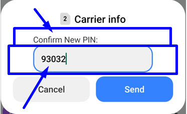 ৬নং ধাপ : Send করার পর আপনার সামনে একটা Carrier inof নামক একটা অপশন আসবে । সেখান Confirm New PIN লিখা দেখবেন। এখন আপনি আপনার Keybord থেকে 5 সংখ্যার পিন নিশ্চিত করার জন্য আবরও লিখুন। লিখে Send বাটনে ক্লিক করুন।