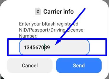 ৩য় ধাপ : Send করার পর আপনার সামনে একটা Carrier inof নামক একটা অপশন আসবে । সেখান Enter your bkash registered NID/Passport/Driving License Number লিখা দেখবেন। এখন আপনি আপনার Keybord থেকে ফাঁকা স্থানে আপনি যেটা দিয়ে বিকাশ খুলেছেন সেটির নাম্বার (NID Number) লিখে Send বাটনে ক্লিক করুন।
