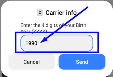 ৪নং ধাপ : Send করার পর আপনার সামনে একটা Carrier inof নামক একটা অপশন আসবে । সেখান Enter the 4digits of your Birth Year (YYYY) লিখা দেখবেন। এখন আপনি আপনার Keybord থেকে ফাঁকা স্থানে আপনার জন্ম সাল লিখে Send বাটনে ক্লিক করুন।