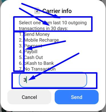 আপনি আপনার Keybord থেকে ফাঁকা স্থানে ৩০ দিনের মধ্যে আপনার যে ধরনের লেন-দেন করা আছে সেই নাম্বারটি লিখে Send বাটনে ক্লিক করুন।