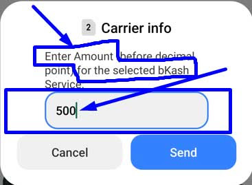 ৬নং ধাপ : Send করার পর আপনার সামনে একটা Carrier inof নামক একটা অপশন আসবে । সেখান Enter Amount ( before decimal point) for the selectsd bkash Service লিখা দেখবেন।এখন আপনি আপনার Keybord থেকে ফাঁকা স্থানে আপনার কত টাকা লেন-দেন করেছেন আর পরিমান লিখে Send বাটনে ক্লিক করুন।