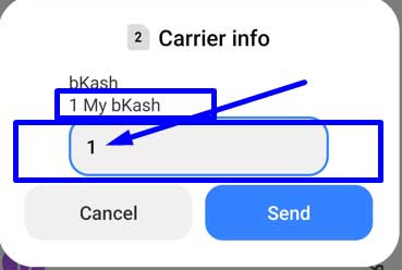 ২নং ধাপ : Send করার পর আপনার সামনে একটা Carrier inof নামক একটা অপশন আসবে । সেখান 1 My bkash লিখা দেখবেন। এখন আপনি আপনার Keybord থেকে 1 লিখে Send বাটনে ক্লিক করুন।