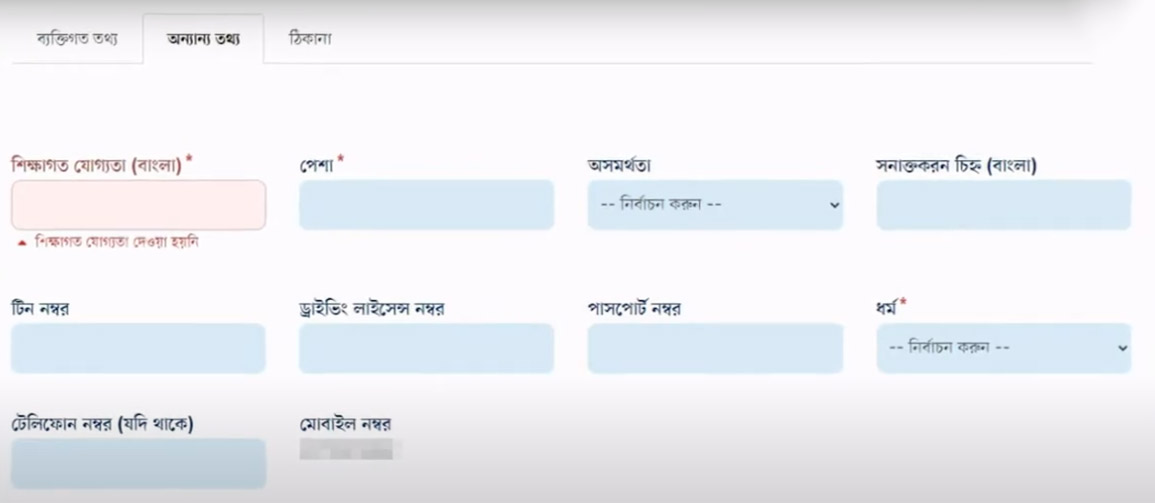 এরপর পূরণ করতে হবে আপনার শিক্ষাগত যোগ্যতা। এখানে লিখতে হবে আপনার পেশা,