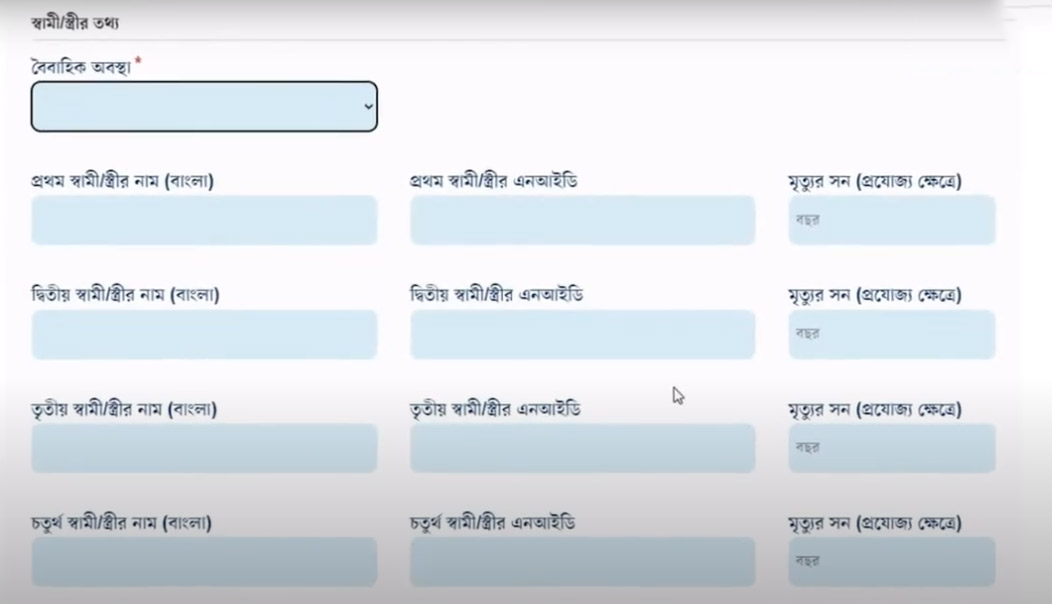 তারপর যদি আবেদনকারীর বিবাহিত হলে বৈবাহিক অবস্থা উল্লেখ করে স্বামী বা স্ত্রীর